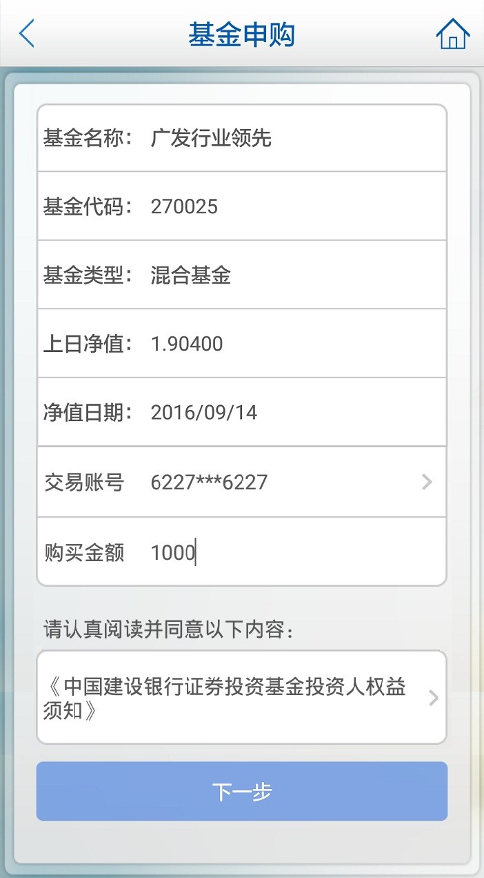 下拉选择银行账号并填写购买金额,阅读并同意《中国建设银行证券投资基金投资人权益须知》,点击“下一步”。
