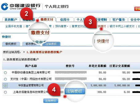 2.在“缴费支付”页签下点击进入“快捷付”页面,选择要注销的商户名称后,点击“注销授权”。