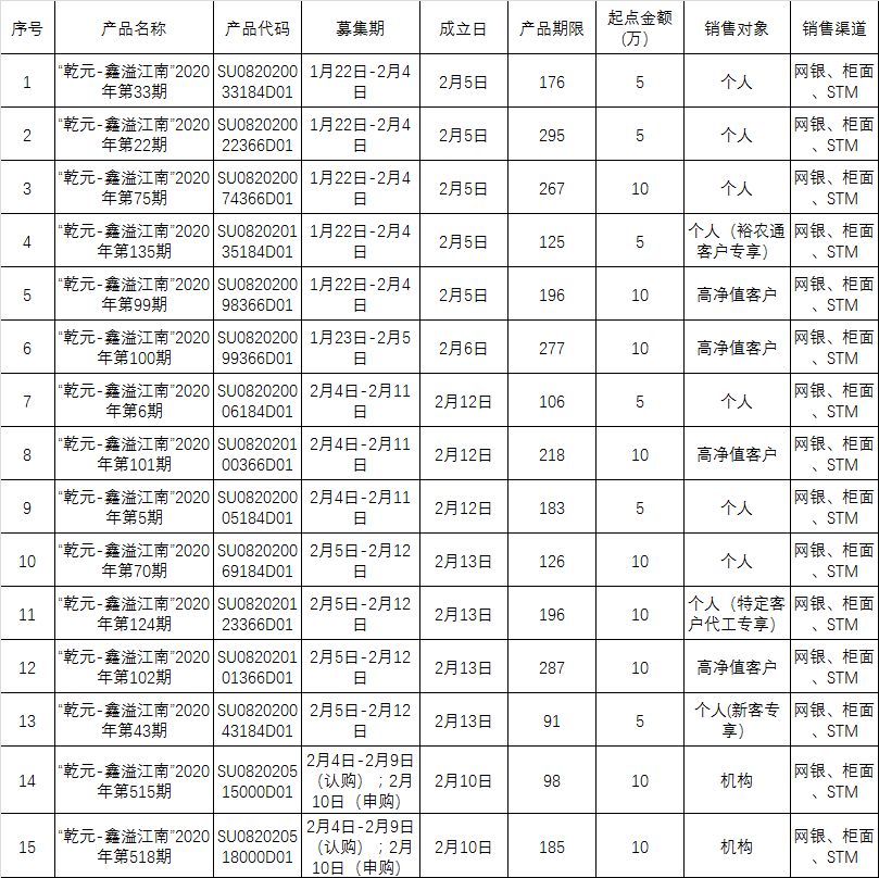 为切实保障客户权益,保证理财业务平稳运营,2020年2月3日至2020年2月7日,中国建设银行股份有限公司苏州分行发行的“乾元-鑫溢江南”资产组合型人民币理财产品开放式产品正常开放申购、赎回;期次型产品正常成立、到期、兑付。目前“乾元-鑫溢江南”理财产品在售清单如下: